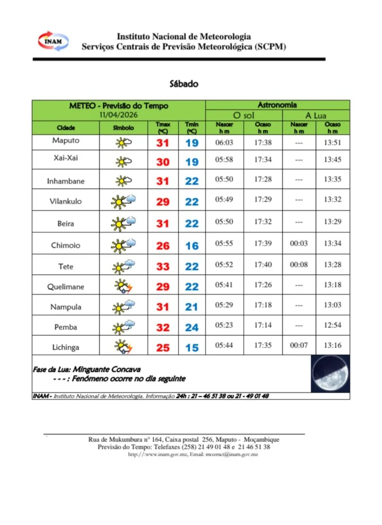 O Instituto Nacional de Meteorologia (INAM) divulgou a previsão do tempo para esta sexta-feira, 10 de Abril, apontando para temperaturas…