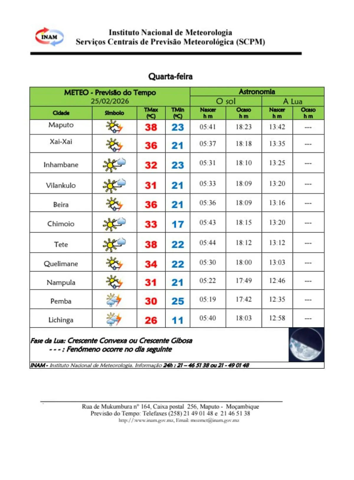 O Instituto Nacional de Meteorologia (INAM) prevê para esta quarta-feira, 25 de Fevereiro de 2026, temperaturas elevadas em grande parte do território nacional, com máximas que atingem os 38 graus Celsius em algumas regiões. O cenário combina calor intenso, ocorrência de trovoadas isoladas e variação de nebulosidade.