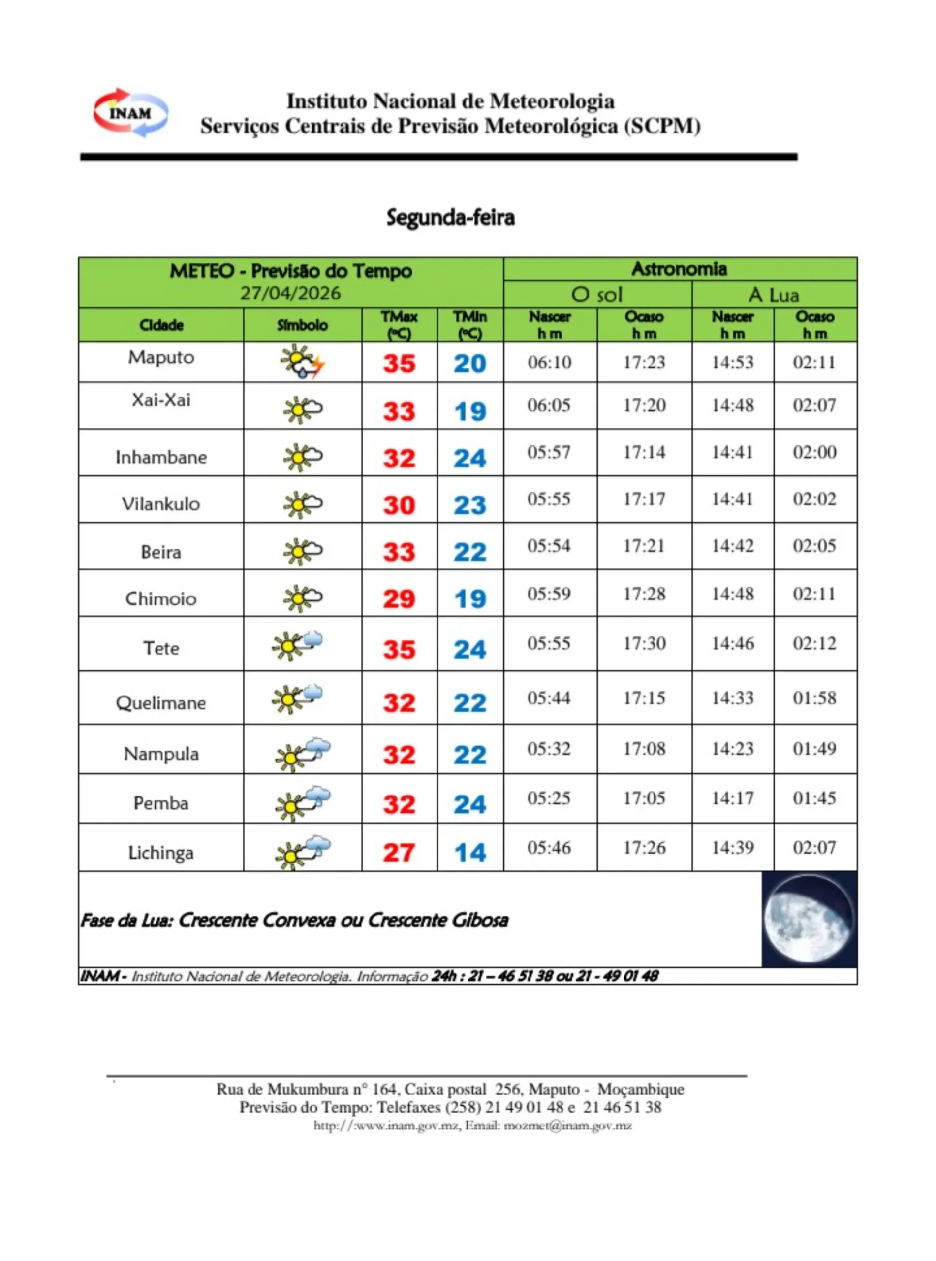 O Instituto Nacional de Meteorologia (INAM) prevê para esta segunda-feira, 27 de Abril de 2026, um cenário climático marcado por temperaturas elevadas em grande parte do território nacional, com განსაკუთრ destaque para as regiões Sul e Centro, onde os termómetros poderão atingir os 35 graus Celsius.