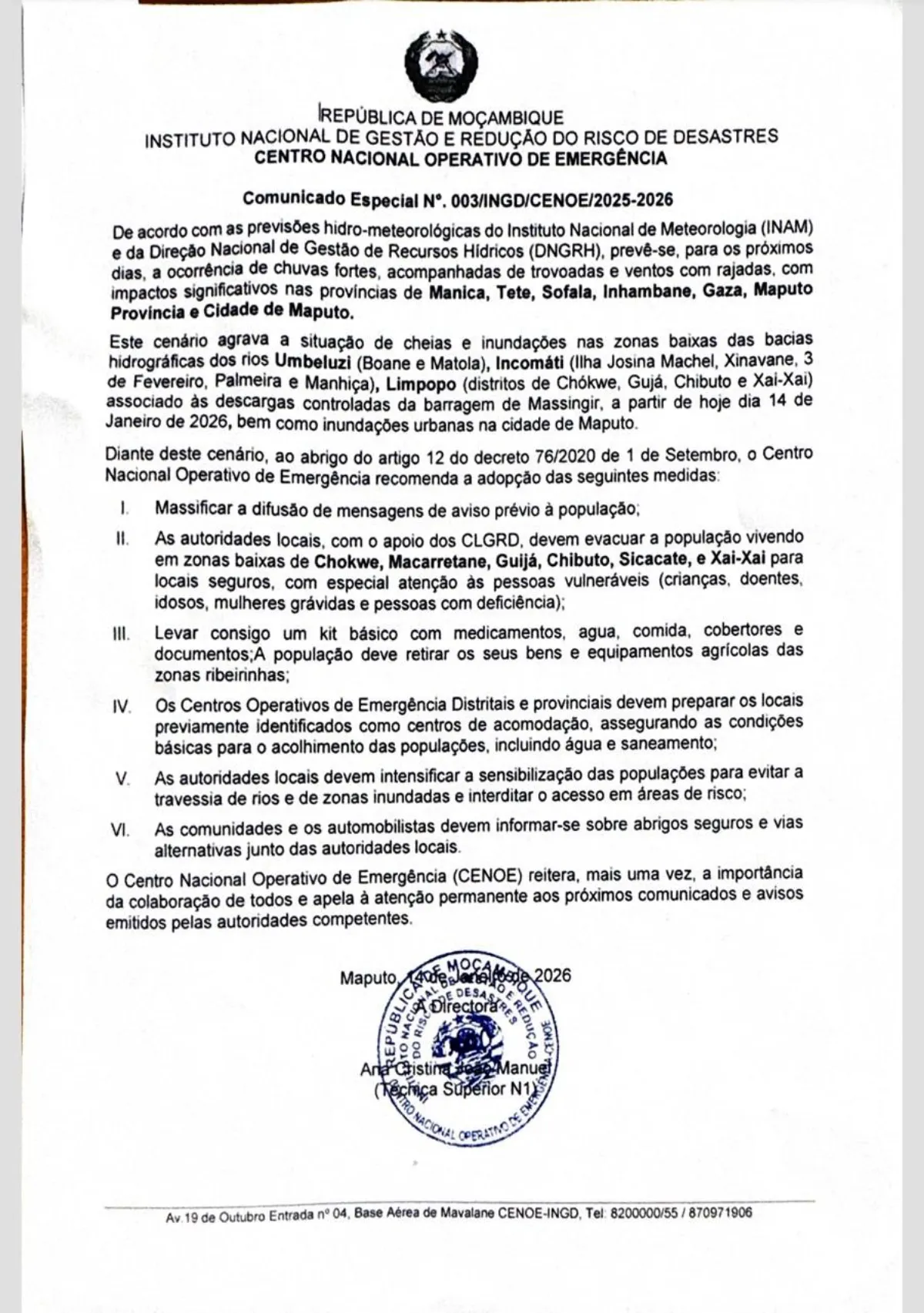 O Instituto Nacional de Gestão e Redução do Risco de Desastres (INGD), através do Centro Nacional Operativo de Emergência (CENOE), emitiu um Comunicado Especial n.º 003/INGD/CENOE/2025–2026, alertando para a ocorrência de chuvas fortes, trovoadas e ventos com rajadas nos próximos dias, com impactos significativos em várias regiões do país.