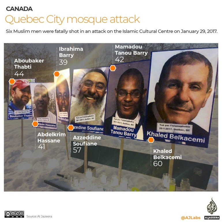 Seis homens muçulmanos foram mortos quando um homem armado abriu fogo no Centro Cultural Islâmico de Quebec, na cidade de Quebec, em 29 de janeiro de 2017. marcando o ataque mais mortal em uma casa de culto na história canadense.