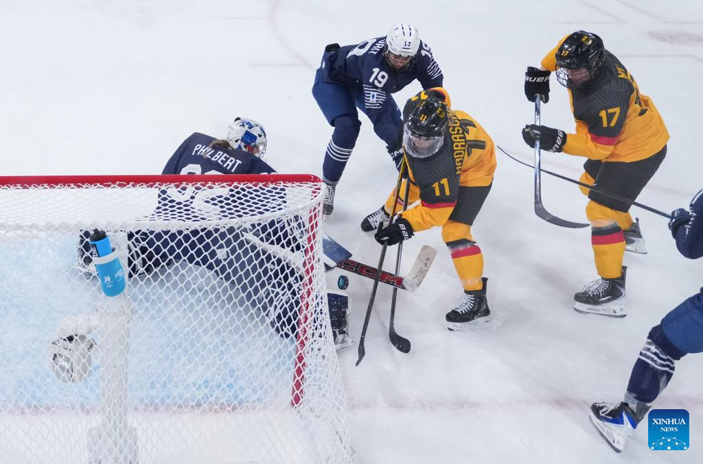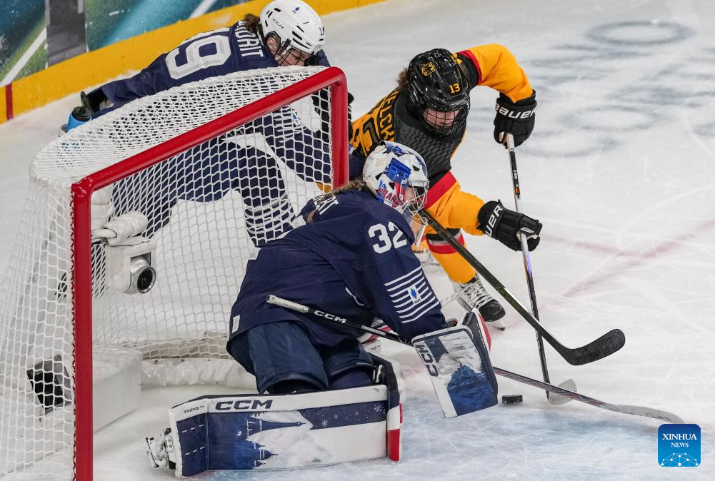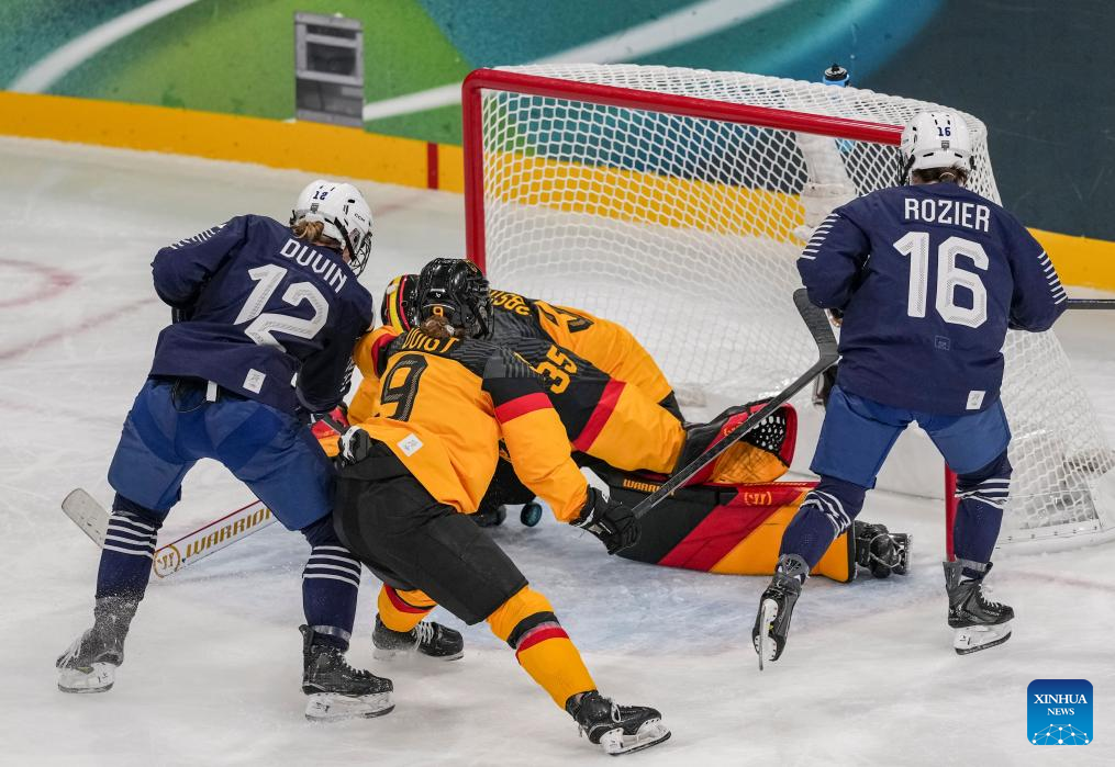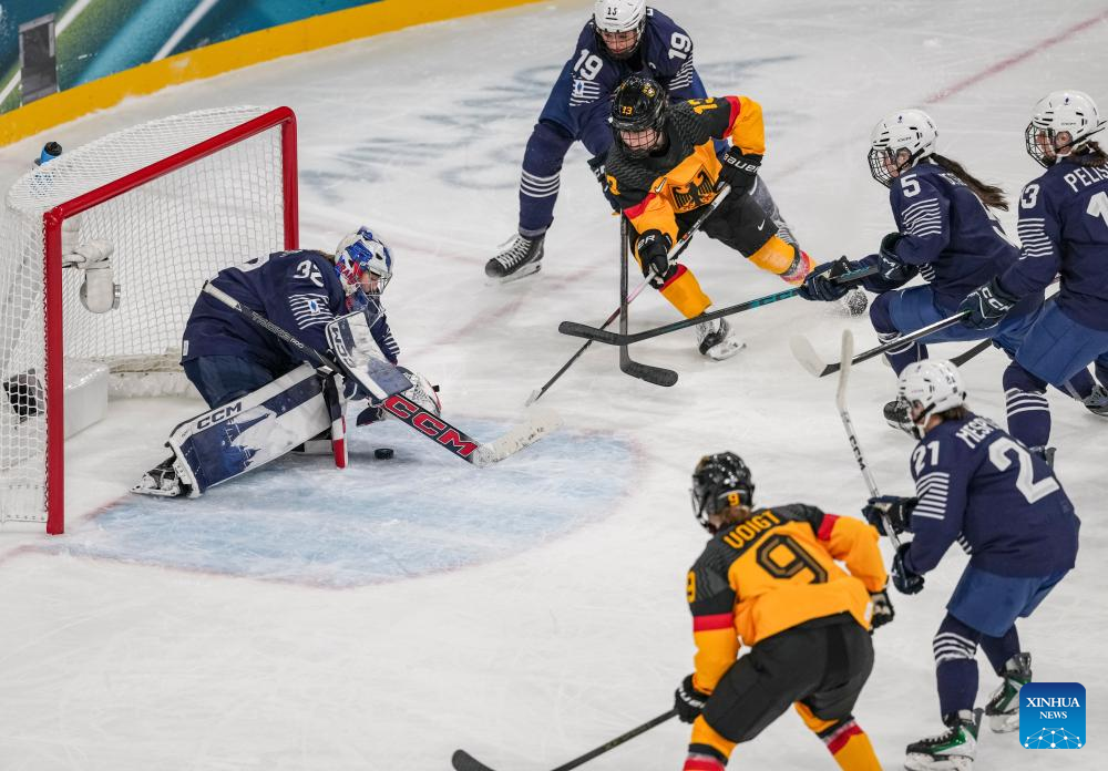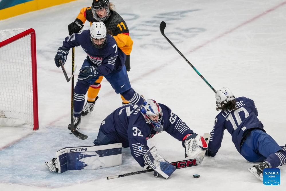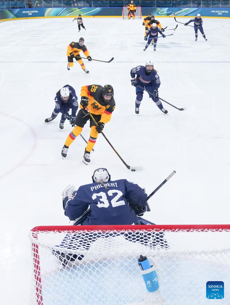 Goalkeeper Alice Philbert (1st L) of France defends during the ice hockey women’s preliminary round group B match between Germany and France at the Milan-Cortina 2026 Olympic Winter Games in Milan, Italy, Feb. 9, 2026. (Xinhua/Wang Kaiyan)