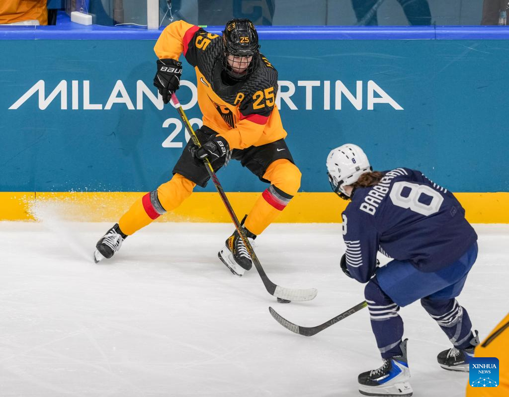Laura Kluge (L) of Germany vies with Jade Barbirati of France during the ice hockey women’s preliminary round group B match between Germany and France at the Milan-Cortina 2026 Olympic Winter Games in Milan, Italy, Feb. 9, 2026. (Xinhua/Sun Fei)