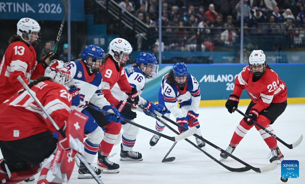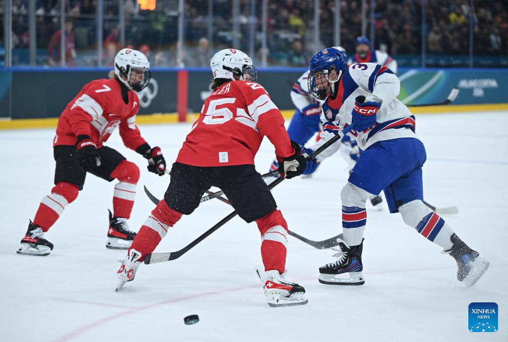 Alina Muller (C) of Switzerland vies with Cayla Barnes of the United States during the ice hockey women’s preliminary round group A match between Switzerland and the United States at the Milan-Cortina 2026 Olympic Winter Games in Milan, Italy, Feb. 9, 2026. (Xinhua/Zhang Haofu)