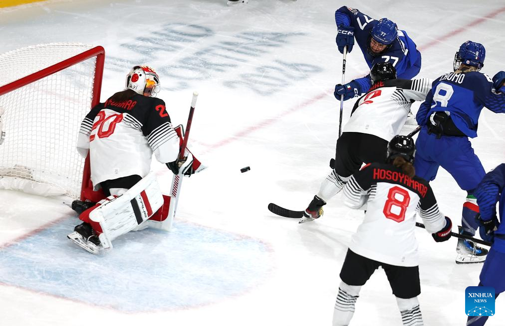 Laura Fortino of Italy (up) shoots during the ice hockey women’s preliminary round group B match between Japan and Italy at the Milan-Cortina 2026 Olympic Winter Games in Milan, Italy, Feb. 9, 2026. (Xinhua/Meng Chenguang)