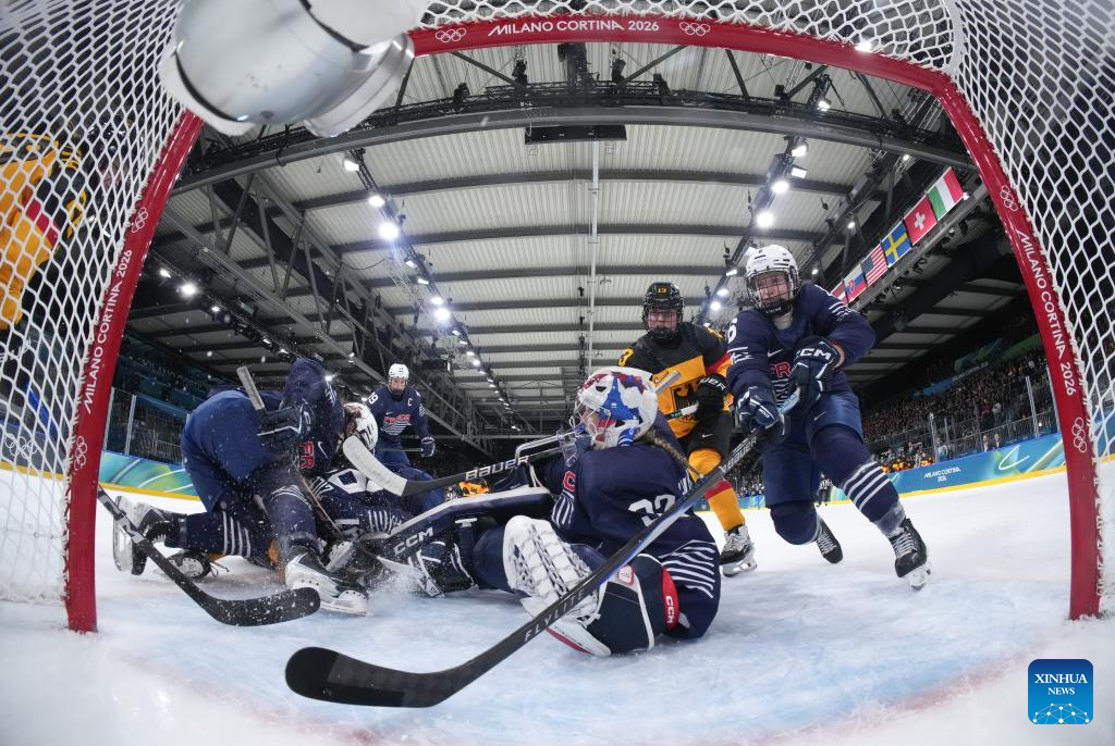 Players of both sides vie for the puck during the ice hockey women’s preliminary round group B match between Germany and France at the Milan-Cortina 2026 Olympic Winter Games in Milan, Italy, Feb. 9, 2026. (Xinhua/Wang Kaiyan)