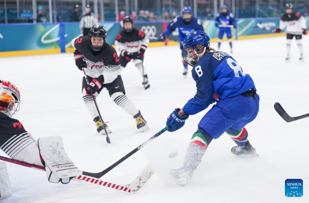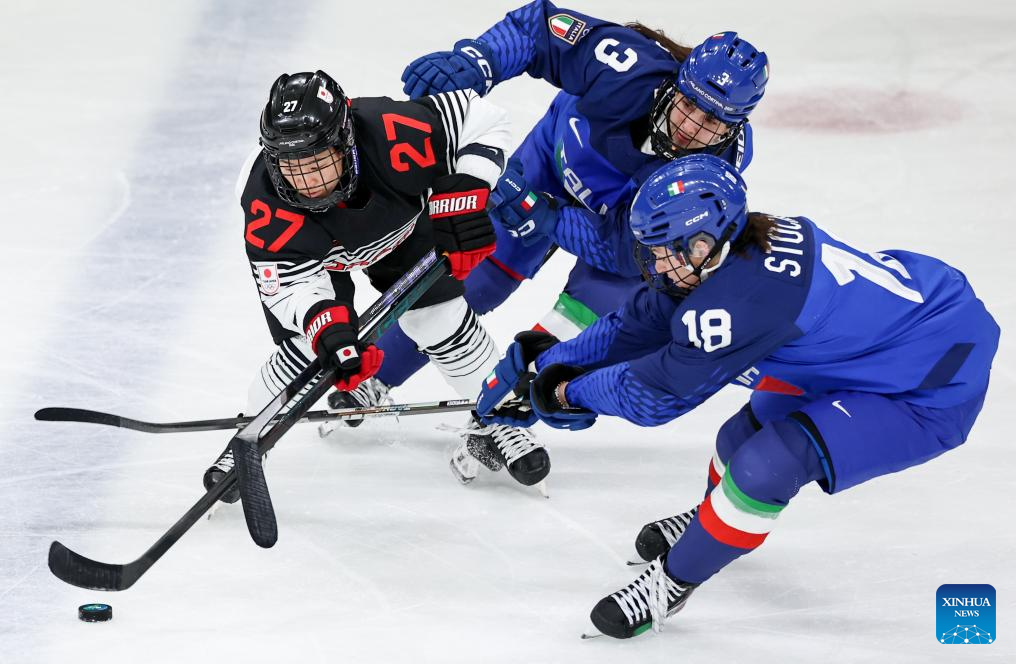 Anna Caumo of Italy tries to shoot during the ice hockey women’s preliminary round group B match between Japan and Italy at the Milan-Cortina 2026 Olympic Winter Games in Milan, Italy, Feb. 9, 2026. (Xinhua/Tao Xiyi)