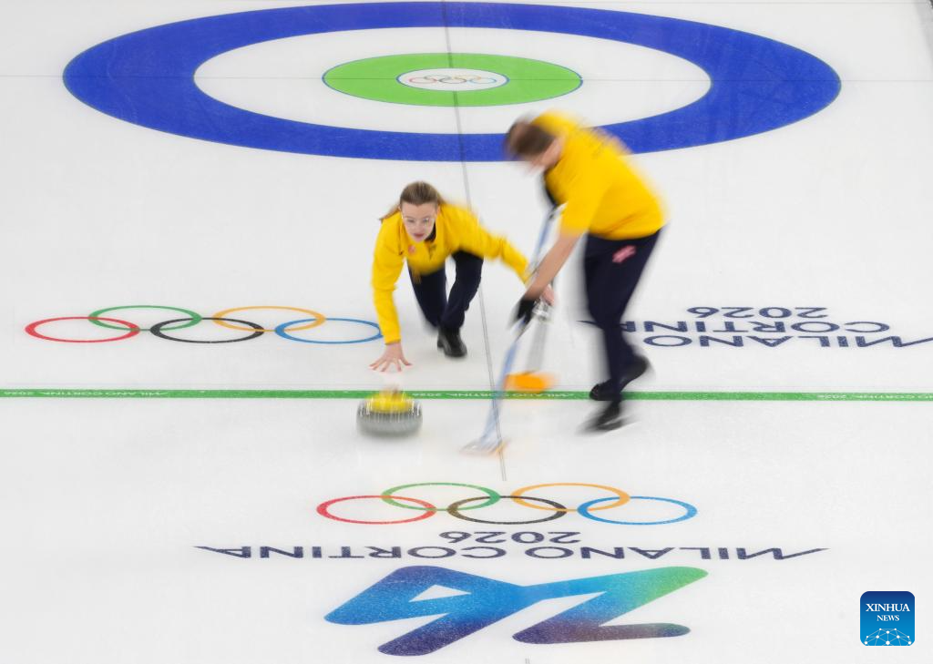 Isabella Wranaa (E) e Rasmus Wranaa, da Suécia, competem durante a partida da segunda rodada da fase de grupos de duplas mistas de curling entre a República Tcheca e a Suécia nos Jogos Olímpicos de Inverno de Milão-Cortina 2026, em Cortina D’Ampezzo, Itália, em 5 de fevereiro de 2026. (Xinhua/Li Gang)