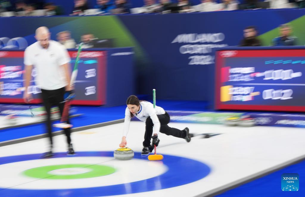 Stefania Constantini (à direita) e Amos Mosaner, da Itália, competem durante a segunda sessão da fase de grupos de duplas mistas de curling entre Itália e Coreia do Sul nos Jogos Olímpicos de Inverno de Milão-Cortina 2026, em Cortina D’Ampezzo, Itália, em 5 de fevereiro de 2026. (Xinhua/Li Gang)