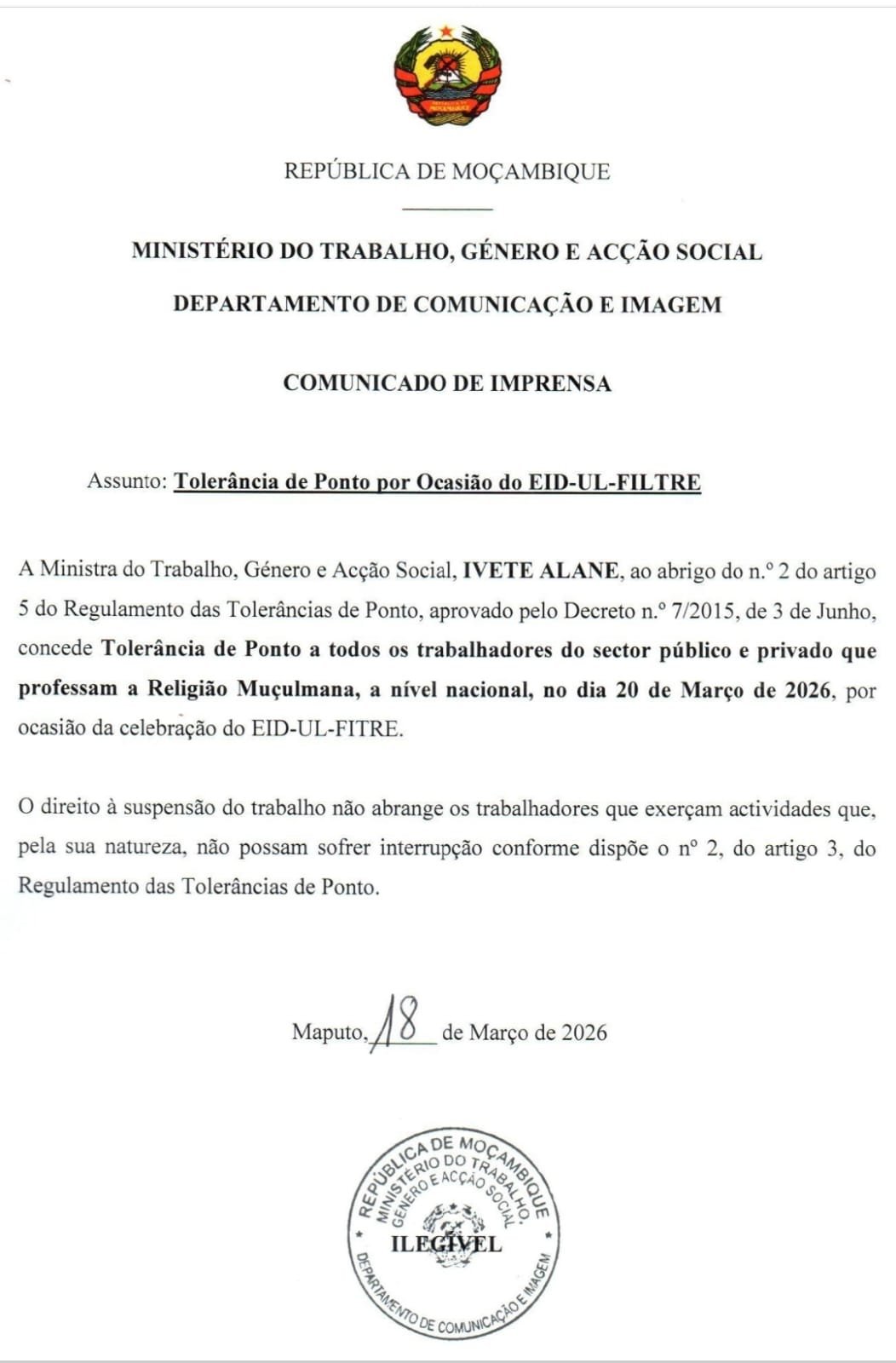 O Governo de Moçambique concedeu tolerância de ponto aos trabalhadores que professam a religião muçulmana, por ocasião da celebração do Eid-ul-Fitr, a assinalar-se no próximo dia 20 de Março.