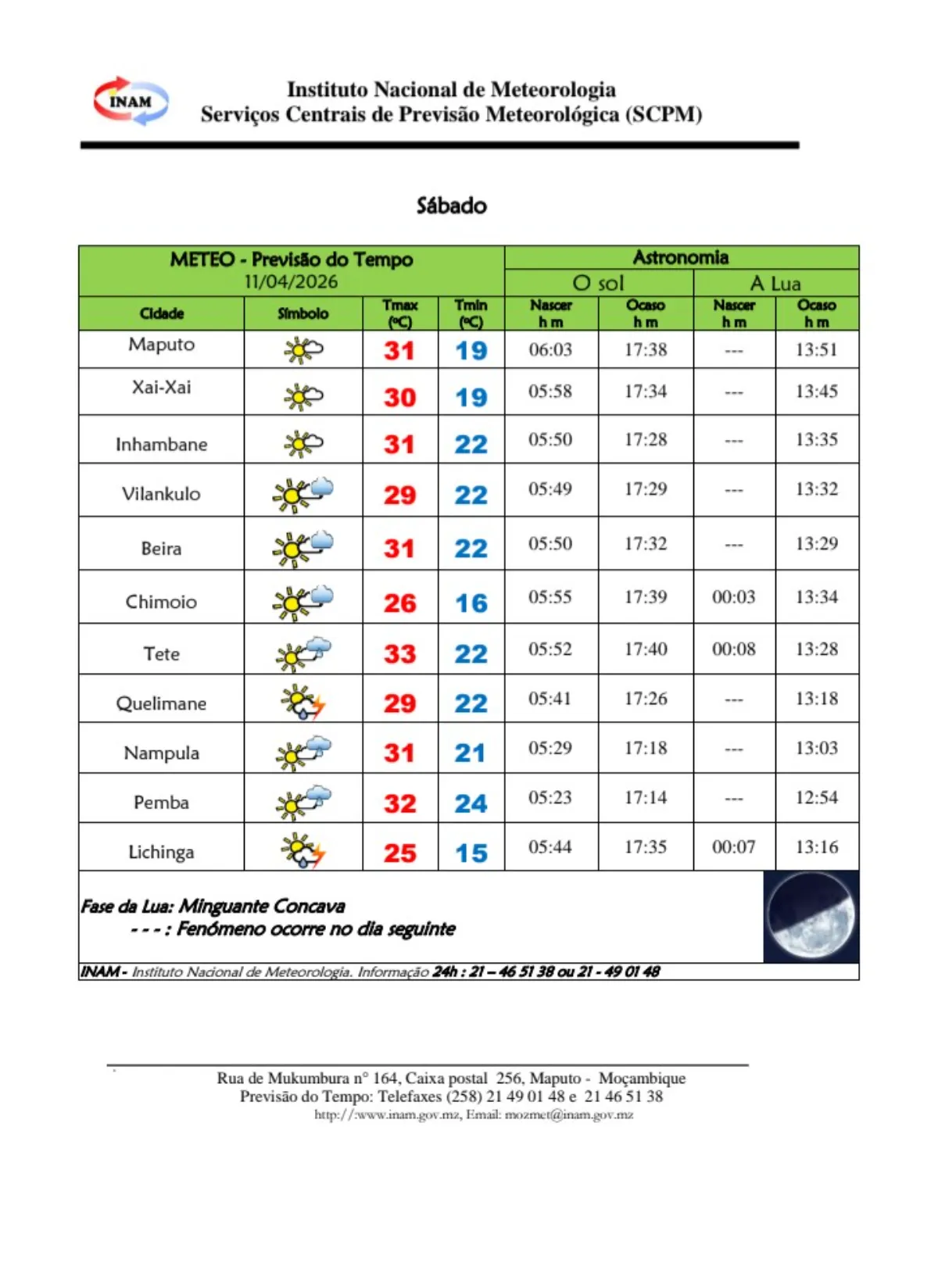 O Instituto Nacional de Meteorologia (INAM) prevê para este sábado, 11 de Abril de 2026, um cenário climático marcado por temperaturas elevadas em praticamente todo o território nacional, combinadas com ocorrência de chuvas fracas e trovoadas isoladas em algumas regiões.