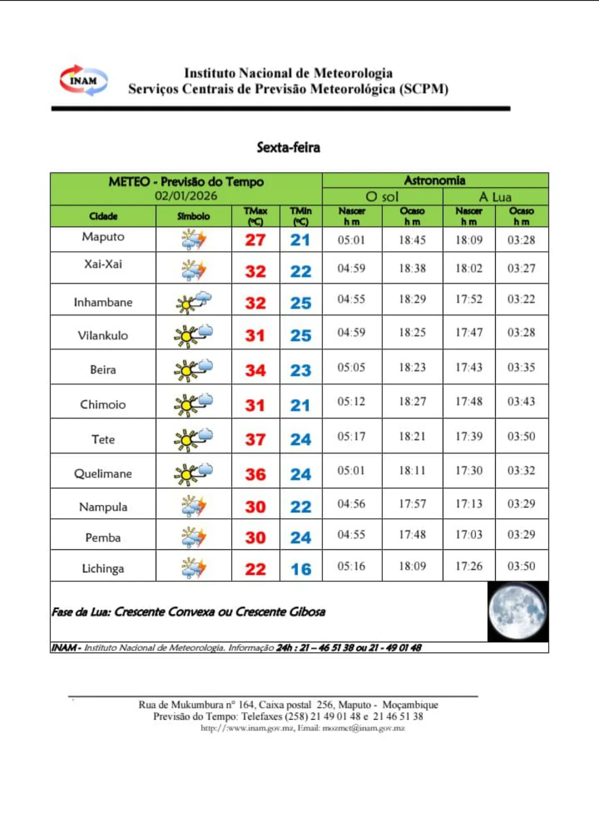 O Instituto Nacional de Meteorologia (INAM) prevê para esta sexta-feira, 02 de Janeiro de 2026, condições meteorológicas marcadas por calor intenso, sobretudo nas regiões Centro e Norte do país, com temperaturas máximas a ultrapassarem os 35 graus Celsius em algumas cidades.