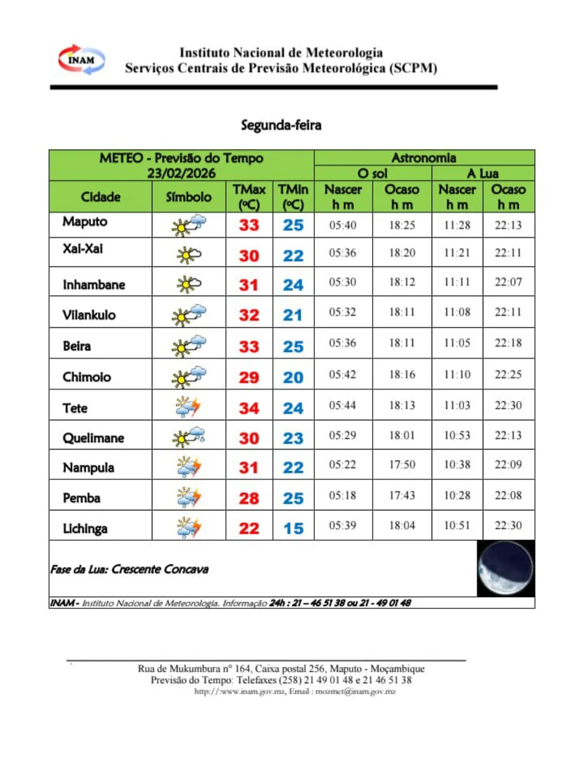 Maputo, 23 de Fevereiro de 2026 — O Instituto Nacional de Meteorologia (INAM) prevê temperaturas elevadas e ocorrência de chuvas com trovoadas em várias províncias do país nesta segunda-feira.
