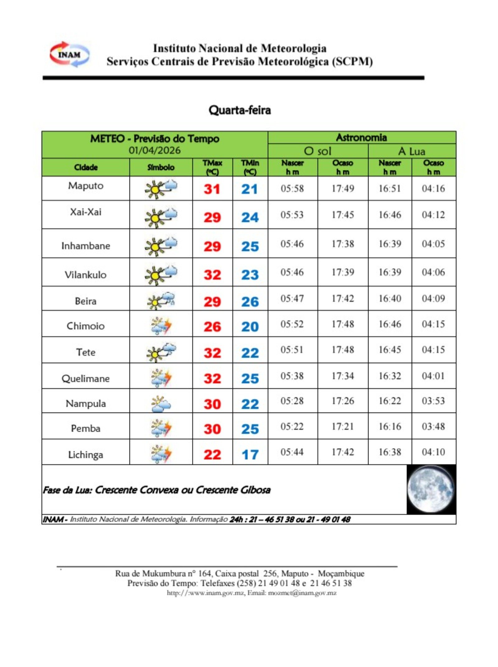 O Instituto Nacional de Meteorologia (INAM) alerta para uma alteração no estado do tempo com impacto directo já esta terça-feira, 01 de Abril, marcando o início de um período de instabilidade atmosférica em várias regiões do país.