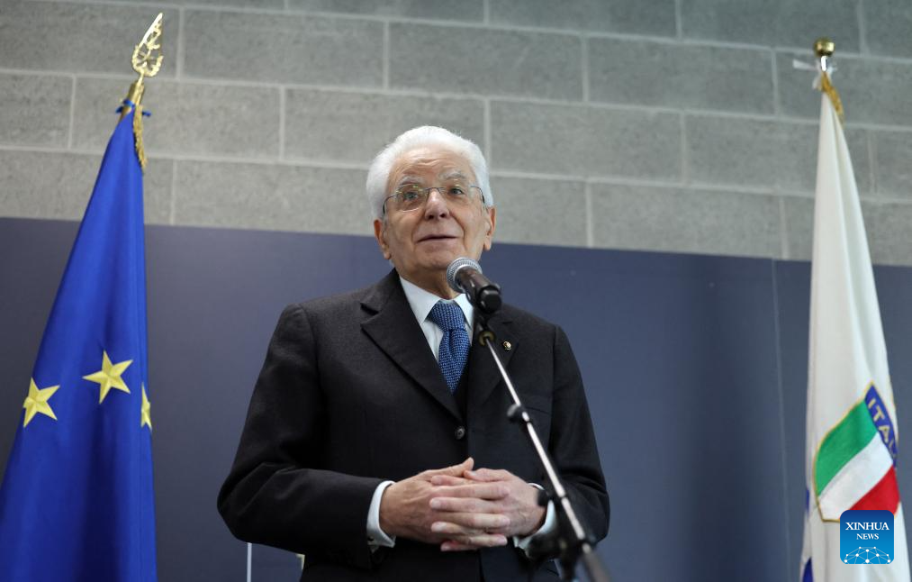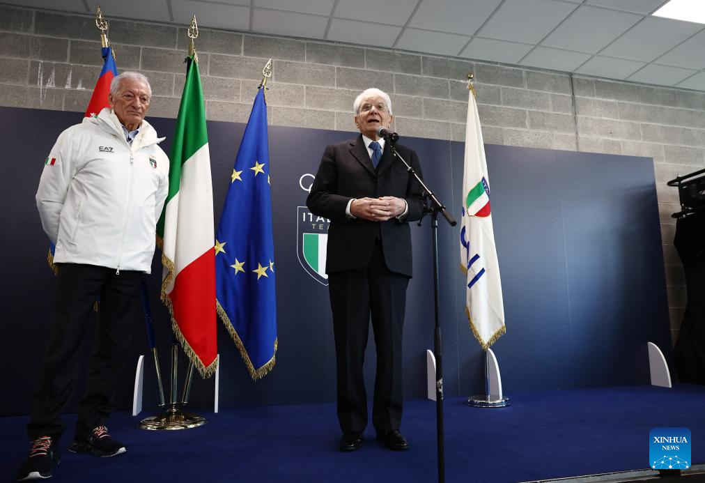 O presidente italiano Sergio Mattarella discursa durante sua visita à Vila Olímpica, em preparação para os Jogos Olímpicos de Inverno de Milão-Cortina 2026, em Milão, Itália, em 5 de fevereiro de 2026. (Yara Nardi/Pool via Xinhua)