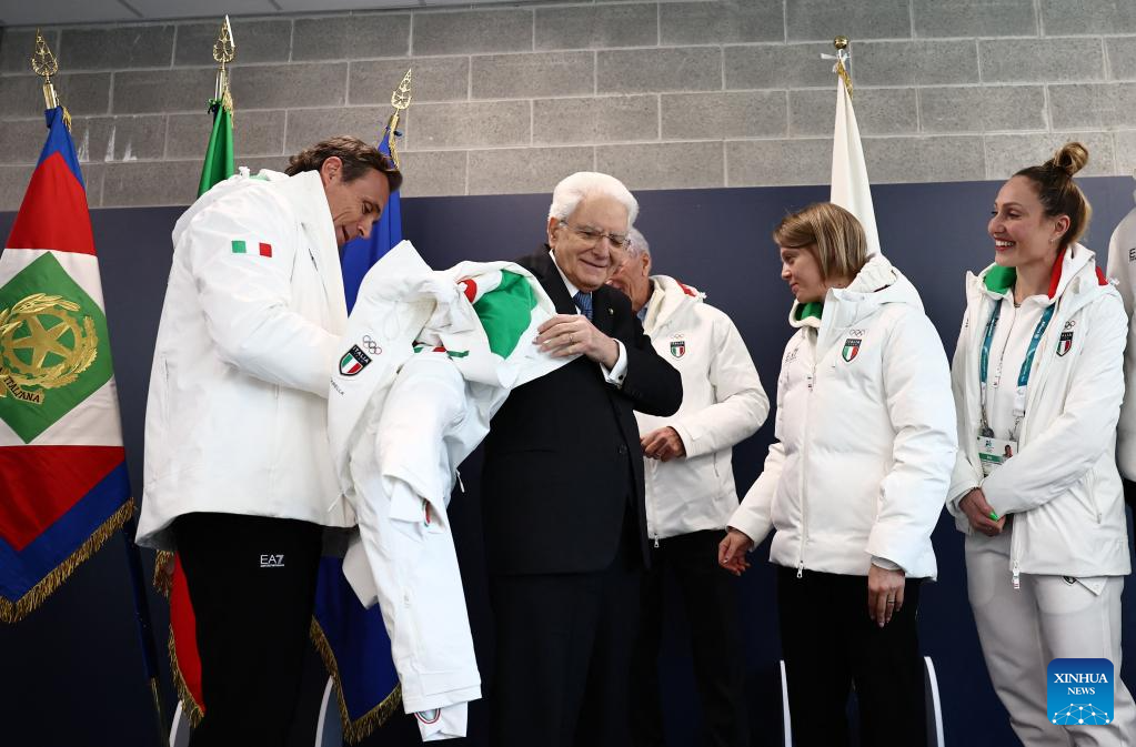 O presidente italiano Sergio Mattarella veste um casaco olímpico italiano durante sua visita à Vila Olímpica antes dos Jogos Olímpicos de Inverno de Milão-Cortina 2026, em Milão, Itália, em 5 de fevereiro de 2026. (Yara Nardi/Pool via Xinhua)