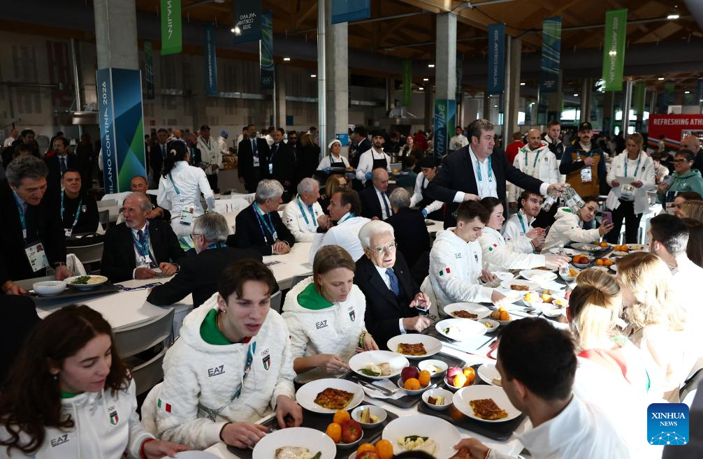 O presidente italiano Sergio Mattarella almoça com atletas italianos durante sua visita à Vila Olímpica, antes dos Jogos Olímpicos de Inverno de Milão-Cortina 2026, em Milão, Itália, em 5 de fevereiro de 2026. (Yara Nardi/Pool via Xinhua)