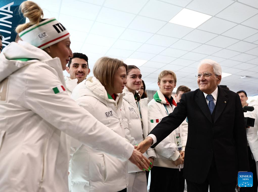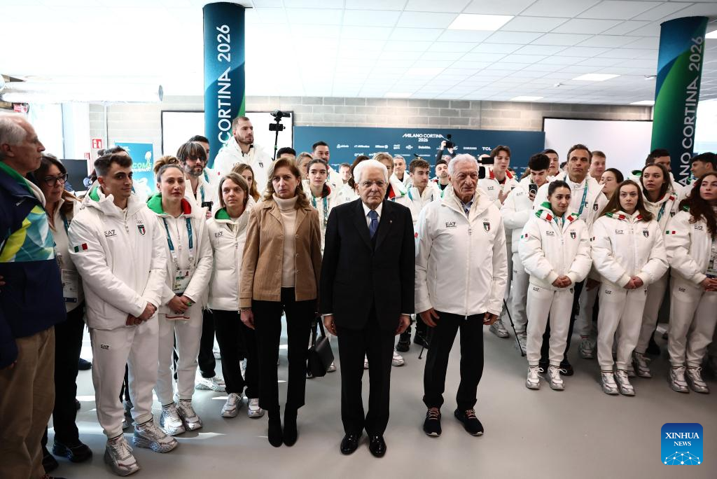 O presidente italiano Sergio Mattarella visita a Vila Olímpica antes dos Jogos Olímpicos de Inverno de Milão-Cortina 2026 em Milão, Itália, em 5 de fevereiro de 2026. (Yara Nardi/Pool via Xinhua)