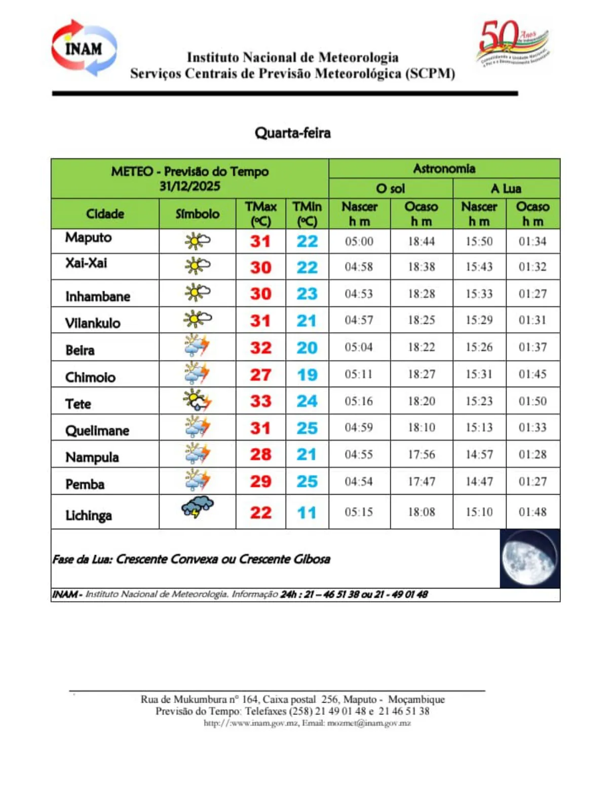 O Instituto Nacional de Meteorologia (INAM) divulgou a previsão do tempo para Moçambique, válida até ao dia 31 de Dezembro…