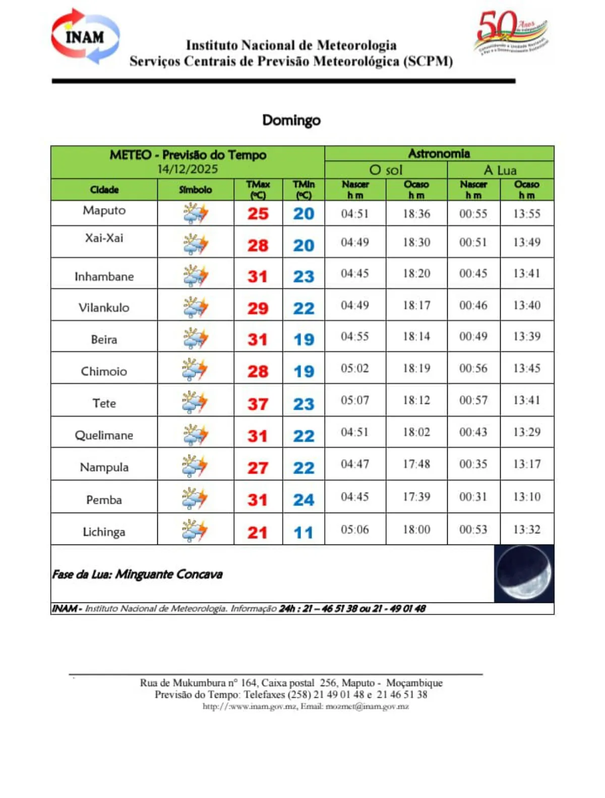 Esta previsão foi divulgada pelo Instituto Nacional de Meteorologia, através do seu canal oficial Meteo Moçambique-INAM, reconhecido como a principal fonte de informações meteorológicas do país.